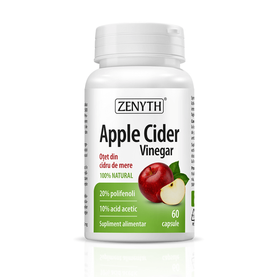 Oțetul de mere este un produs 100% natural, obținut prin fermentația sucului de mere. În primă fază, zaharurile din suc sunt transformate în alcool prin fermentație alcoolică, iar în a doua fază, alcoolul este transformat în oțet prin fermentație acetică. Ingredientul folosit în produsul Apple Cider Vinegar de la Zenyth are dublă standardizare: 20% polifenoli și 10% acid acetic. Acidul acetic, componentul majoritar din oțetul de mere, previne sindromul metabolic, reduce obezitatea și rezistența la insulină, crește producția de oxid nitric și aciditatea din tractul digestiv. Polifenolii din compoziția produsului au proprietăți antioxidante și antiinflamatorii și prezintă efecte hipocolesterolemiante, hipoglicemiante, hipotensoare, antimicrobiene și antitrombotice. Pectina din oțetul de mere este o fibră solubilă care stimulează mișcările intestinale, intensifică digestia, diminuează concentrația colesterolului în sânge, îmbunătățește starea vaselor sanguine și previne apariția aterosclerozei.